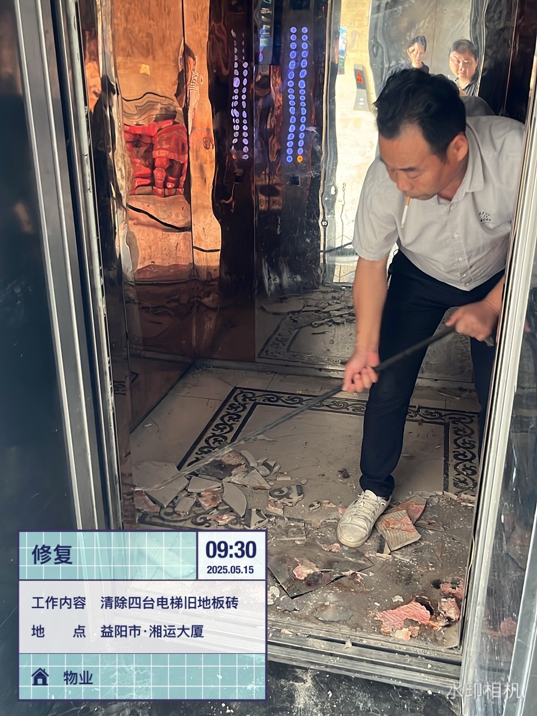為優(yōu)化湘運大廈公共設(shè)施,提升用戶出行安全性與舒適度。5月15日,湖南遠程建設(shè)集團有限公司物業(yè)部按經(jīng)理周琦順要求,對大廈內(nèi)電梯設(shè)施啟動專項改造工程,對三臺客梯及一臺貨梯的陳舊底板進行全面更換。改造前,在副經(jīng)理潘宇文與新裝酒店施工方商討對接后,確定由公司物業(yè)工程人員完成舊底板的拆除清理,由酒店方鋪設(shè)全新耐磨地板的方案,同時創(chuàng)新采用"半覆蓋木板"防護措施,有效降低裝修材料運輸對地面的磨損。針對實施過程中樓內(nèi)裝修施工頻繁的情況,辦公室還特別強調(diào)在每部電梯新增半塊可拆卸木板,既保護新底板免受建材刮擦,又不影響日常使用便利性。(郭燦燦)