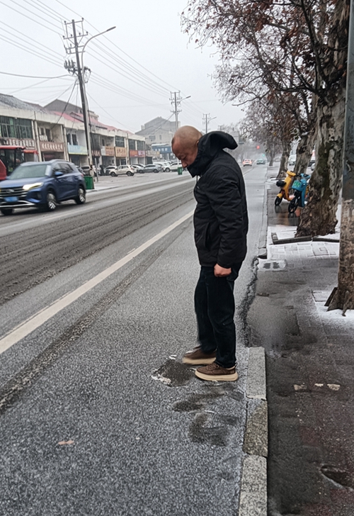 1月20日清晨5:30,益陽(yáng)湘運(yùn)公共交通有限責(zé)任公司副經(jīng)理王鵬正在319國(guó)道結(jié)冰路段進(jìn)行實(shí)地勘查。這是該司應(yīng)對(duì)近日雨雪冰凍天氣保障安全運(yùn)輸?shù)呐e措之一。
